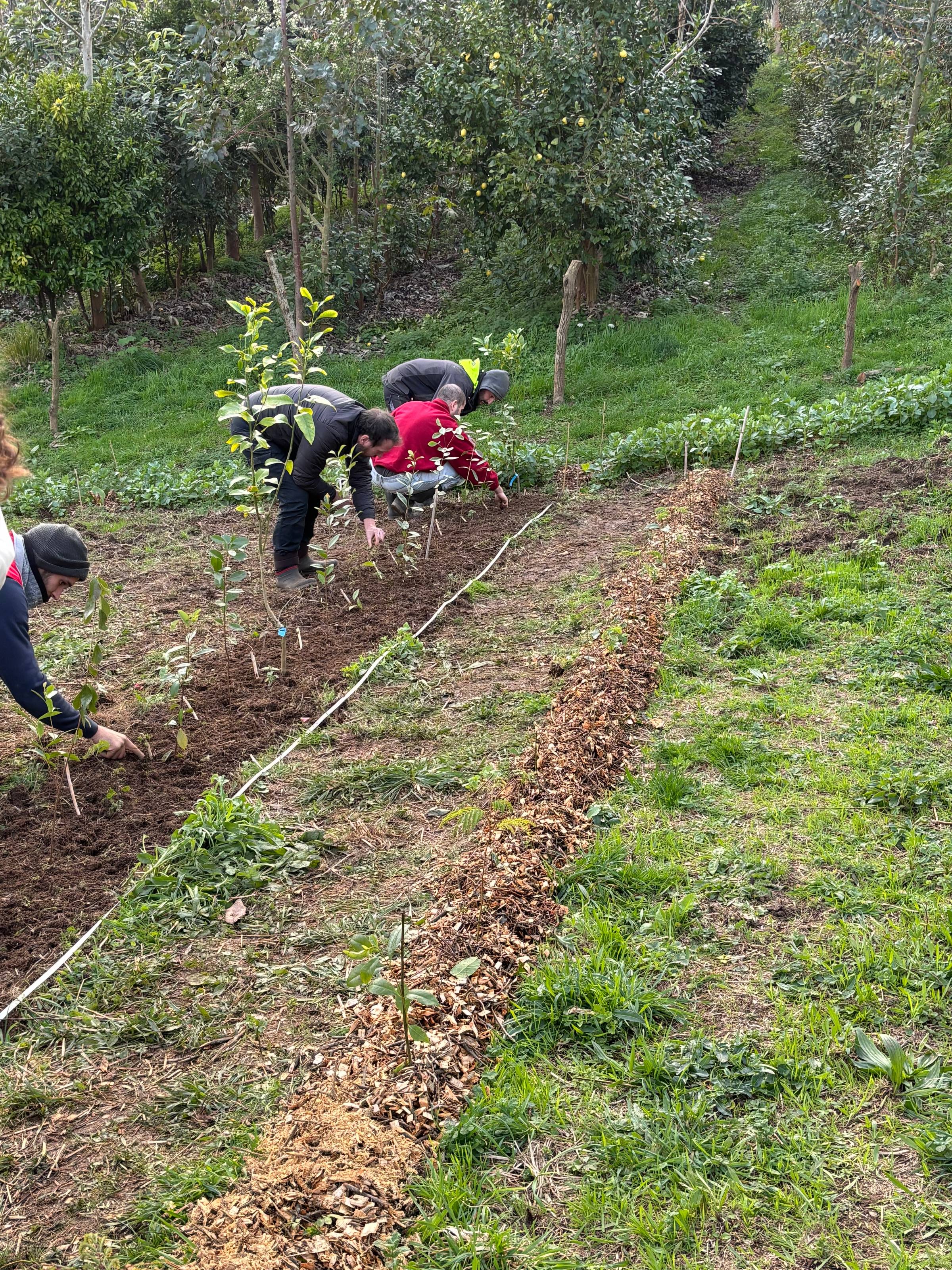 Here you can see a picture. In the front, you can see our newly planted agroforestry line with 30 different species from seed, seedlings, and more developed plants.
